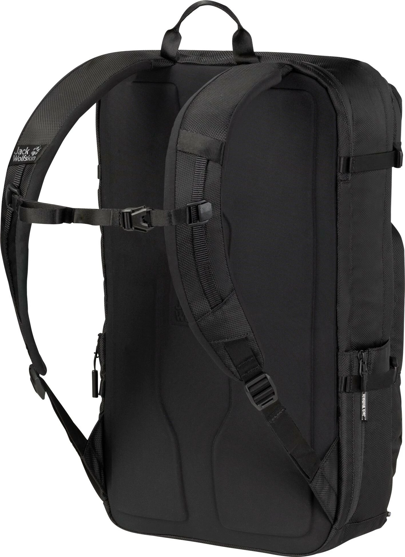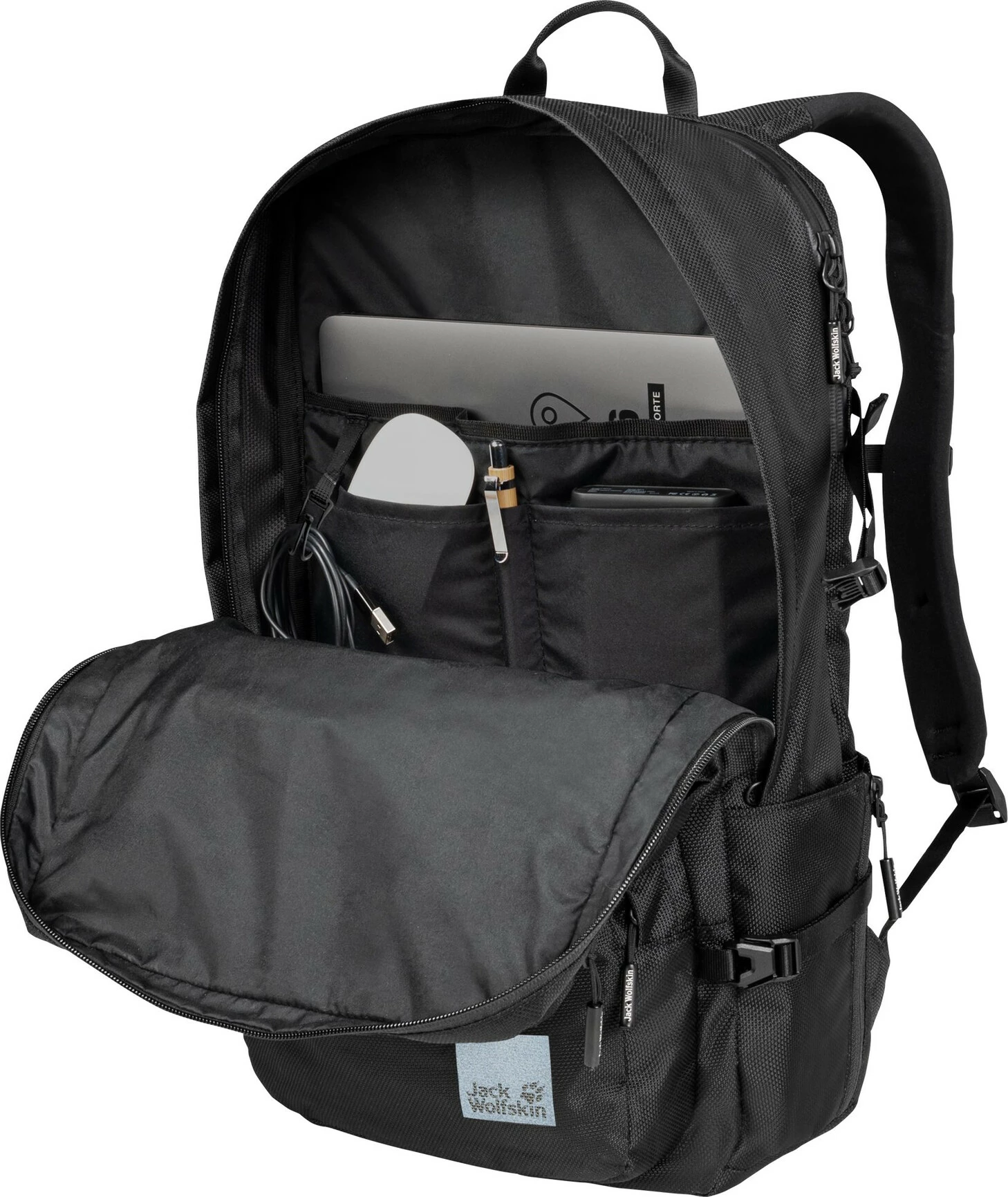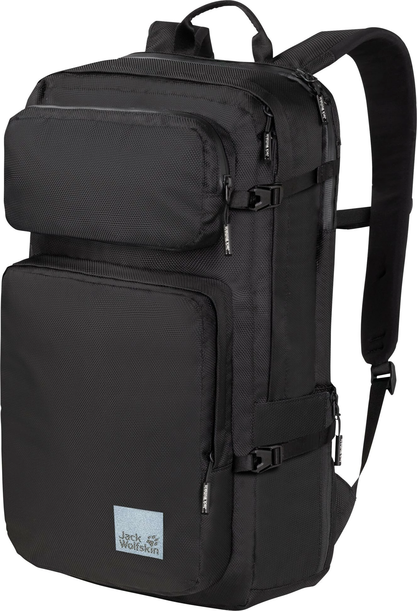 Levé, sac de Tokyo et en route pour ton trajet quotidien vers le bureau. Ton sac à dos spacieux te permet de tout emporter : Ordinateur portable, tablette, stylos, snack pour le petit-déjeuner… En tant que plus grand membre de la collection City Life de Jack Wolfskin, le Tokyo Pack offre un super espace de rangement et une répartition bien pensée des compartiments : Dans le compartiment rembourré qui se trouve juste à côté de ton dos, ton ordinateur portable est parfaitement protégé – même vers le bas, car le compartiment ne va pas jusqu’au sol. Et comme la fermeture éclair est hydrofuge, l’humidité n’y pénètre pas non plus. Dans le grand compartiment principal, tu peux également ranger un petit ordinateur portable – dans un compartiment séparé et rembourré. D’autres petites poches te donnent suffisamment de place pour tout ce dont tu as besoin en déplacement ou au travail. Tu peux même fixer des câbles de chargement ou des écouteurs sur le W Multihook pratique situé dans le compartiment principal. Ainsi, ils ne s’emmêlent pas en cours de route. Les deux grandes poches avant plaquées constituent un point fort visuel et fonctionnel. Ils te permettent de ranger tout ce que tu as besoin d’avoir rapidement sous la main pour aller au bureau ou à l’hôtel. Et pour ta bouteille d’eau, il te suffit de la glisser dans l’une des deux poches latérales, dont le volume peut être augmenté grâce à une fermeture éclair. Autre avantage du Tokyo Pack : le système de portage rembourré super confortable avec canal d’aération. Comme le sac à dos est proche de ton corps, il ne se balance pas d’avant en arrière pendant le trajet. Cela rend le port super agréable – même si tu es parfois en route avec plus de bagages. Comme pour chaque membre de la famille City Life, Jack Wolfskin a donné au Tokyo Pack un design vraiment cool avec différentes nuances de noir et a fabriqué son matériau principal et sa doublure intérieure entièrement à partir de matériaux recyclés. Et pour une meilleure visibilité – notamment à vélo – Jack Wolfskin l’a équipé de détails réfléchissants clairs.